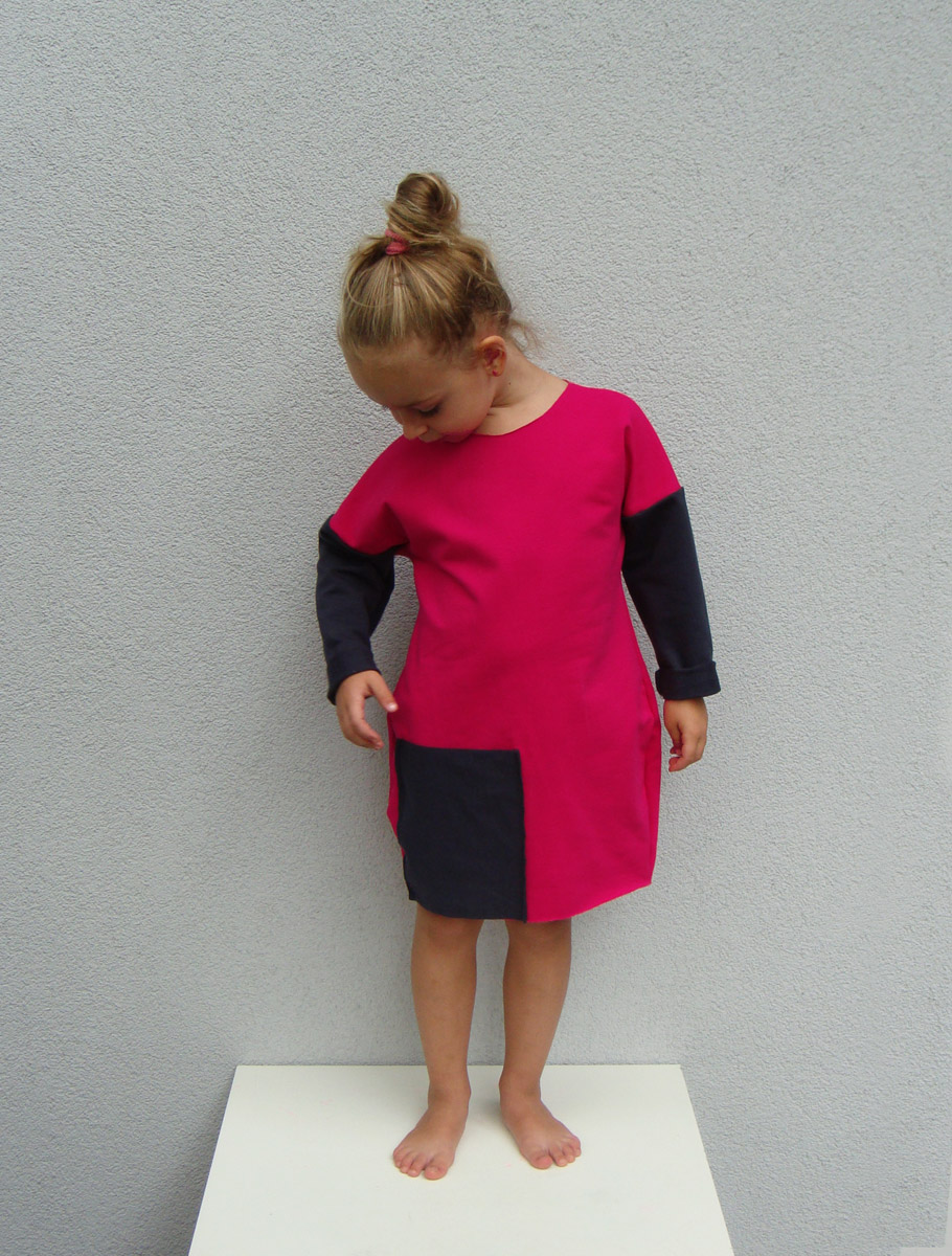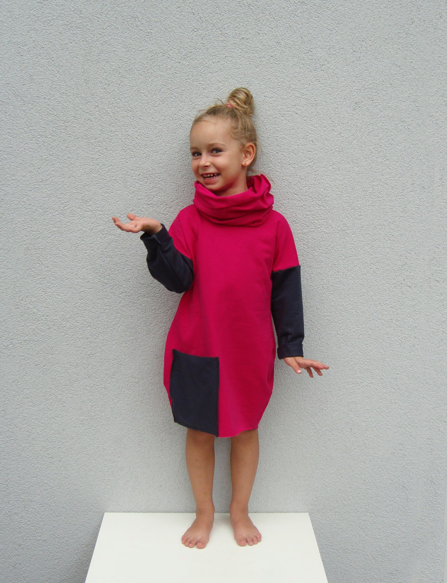 Sukienka w intensywnym różu, z grafitowymi rękawami i kieszenią oraz zdejmowanym kominkiem, który można nosić razem z sukienką lub innymi kompozycjami…
